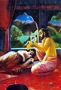 As stated in the Bhagavad-gita, the Lord says that His appearance, birth, and activities, are all transcendental, and one who understands them factually becomes immediately eligible to be transferred to the spiritual world. The Lord's appearance or birth is not like that of an ordinary man who is forced to accept a material body according to his past deeds. The Lord's appearance is explained in the Second Chapter: He appears out of His own sweet pleasure. When the time was mature for the appearance of the Lord, the constellations became very auspicious. The astrological influence of the star known as Rohini was also predominant because this star is considered to be very auspicious. Rohini is under the direct supervision of Brahma. According to the astrological conclusion, besides the proper situation of the stars, there are auspicious and inauspicious moments due to the different situations of the different planetary systems. At the time of Krsna's birth, the planetary systems were automatically adjusted so that everything became auspicious. At that time, in all directions, east, west, south, north, everywhere, there was an atmosphere of peace and prosperity. There were auspicious stars visible in the sky, and on the surface in all towns and villages or pasturing grounds and within the minds of everyone there were signs of good fortune. The rivers were flowing full of waters, and lakes were beautifully decorated with lotus flowers. The forests were full with beautiful birds and peacocks. All the birds within the forests began to sing with sweet voices, and the peacocks began to dance along with their consorts. The wind blew very pleasantly, carrying the aroma of different flowers, and the sensation of bodily touch was very pleasing. At home, the brahmanas, who were accustomed to offer sacrifices in the fire, found their homes very pleasant for offerings. Due to disturbances created by the demoniac kings, the sacrificial fire alter had been almost stopped in the houses of brahmanas, but now they could find the opportunity to start the fire peacefully. Being forbidden to offer sacrifices, the brahmanas were very distressed in mind, intelligence and activities, but just on the point of Krsna's appearance, automatically their minds became full of joy because they could hear loud vibrations in the sky of transcendental sounds proclaiming the appearance of the Supreme Personality of Godhead. The denizens of the Gandharva and Kinnara planets began to sing, and the denizens of Siddhaloka and the planets of the Caranas began to offer prayers in the service of the Personality of Godhead. In the heavenly planets, the angels along with their wives, accompanied by the Apsaras, began to dance. The great sages and the demigods, being pleased, began to shower flowers. At the seashore, there was the sound of mild waves, and above the sea there were clouds in the sky which began to thunder very pleasingly. When things were adjusted like this, Lord Visnu, who is residing within the heart of every living entity, appeared in the darkness of night as the Supreme Personality of Godhead before Devaki, who also appeared as one of the demigoddesses. The appearance of Lord Visnu at that time could be compared with the full moon in the sky as it rises on the eastern horizon. The objection may be raised that, since Lord Krsna appeared on the eighth day of the waning moon, there could be no rising of the full moon. In answer to this it may be said that Lord Krsna appeared in the dynasty which is in the hierarchy of the moon; therefore, although the moon was incomplete on that night, because of the Lord's appearance in the dynasty wherein the moon is himself the original person, the moon was in an overjoyous condition, so by the grace of Krsna he could appear just as a full moon. In an astronomical treatise by the name Khamanikya, the constellations at the time of the appearance of Lord Krsna are very nicely described. It is confirmed that the child born at that auspicious moment was the Supreme Brahman or the Absolute Truth. Vasudeva saw that wonderful child born as a baby with four hands, holding conchshell, club, disc, and lotus flower, decorated with the mark of Srivatsa, wearing the jeweled necklace of kaustubha stone, dressed in yellow silk, appearing dazzling like a bright blackish cloud, wearing a helmet bedecked with the vaidurya stone, valuable bracelets, earrings and similar other ornaments all over His body and an abundance of hair on His head. Due to the extraordinary features of the child, Vasudeva was struck with wonder. How could a newly born child be so decorated? He could therefore understand that Lord Krsna had now appeared, and he became overpowered by the occasion. Vasudeva very humbly wondered that although he was an ordinary living entity conditioned by material nature and was externally imprisoned by Kamsa, the all-pervading Personality of Godhead, Visnu or Krsna, was appearing as a child in his home, exactly in His original position. No earthly child is born with four hands decorated with ornaments and nice clothing, fully equipped with all the signs of the Supreme Personality of Godhead. Over and over again, Vasudeva glanced at his child, and he considered how to celebrate this auspicious moment: "Generally, when a male child is born," he thought, "people observe the occasion with jubilant celebrations, and in my home, although I am imprisoned, the Supreme Personality of Godhead has taken birth. How many millions of millions of times should I be prepared to observe this auspicious ceremony!" When Vasudeva, who is also called Anakadundubhi, was looking at his newborn baby, he was so happy that he wanted to give many thousands of cows in charity to the brahmanas. According to the Vedic system, whenever there is an auspicious ceremony in the ksatriya king's palace, the king gives many things in charity. Cows decorated with golden ornaments are delivered to the brahmanas and sages. Vasudeva wante